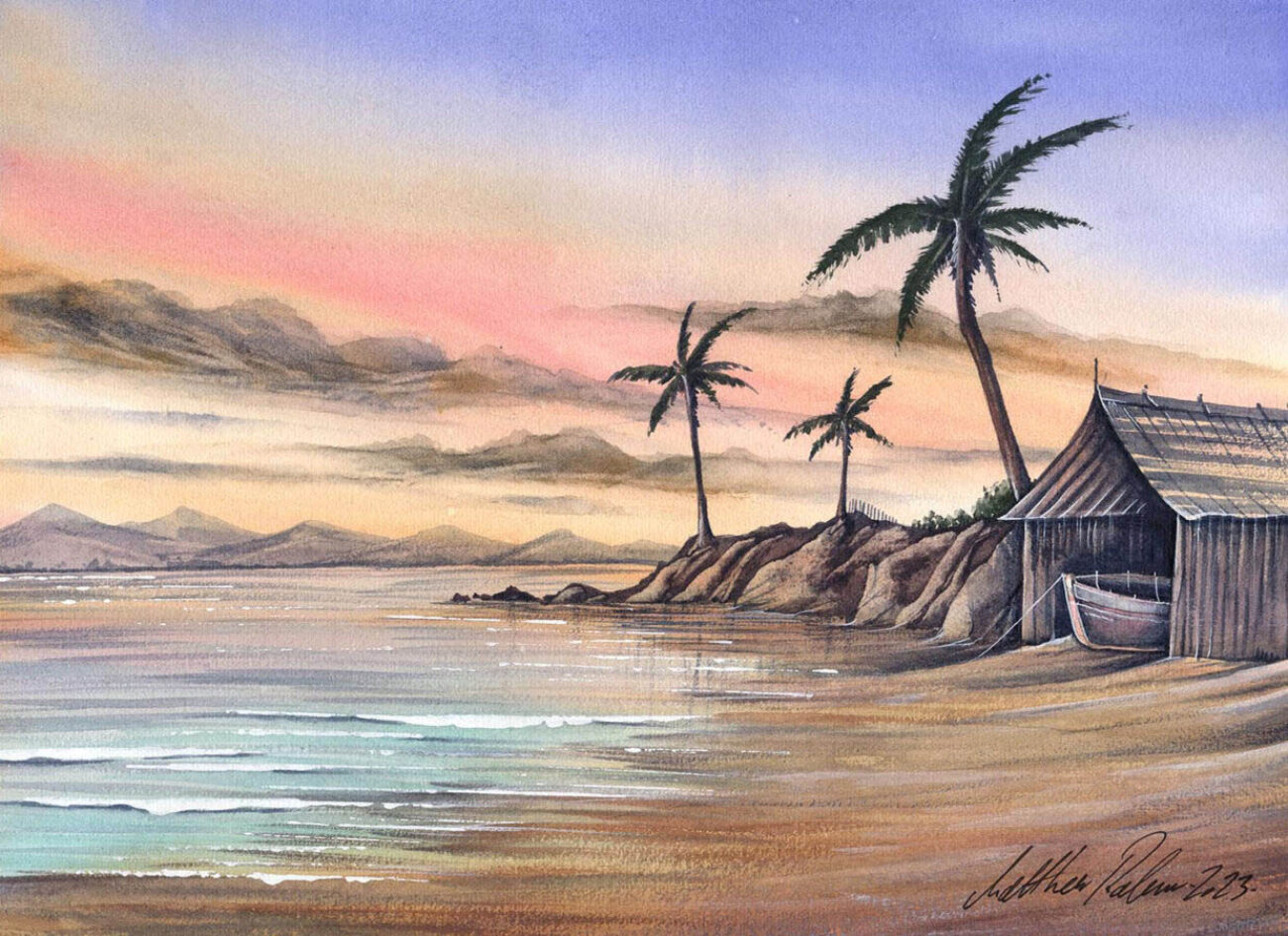 Relax and paint this lovely, tropical scene of a beach with palm trees. Mat...