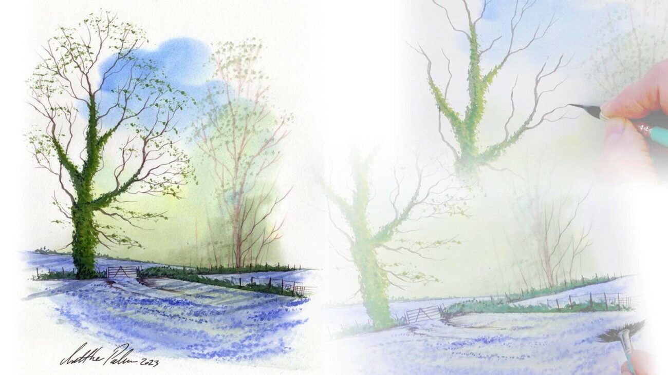 Paint this quick little bluebell painting featuring an ivy covered tree.