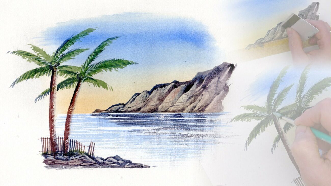 Paint this small, quick watercolour featuring cliffs, rocks and palm trees.