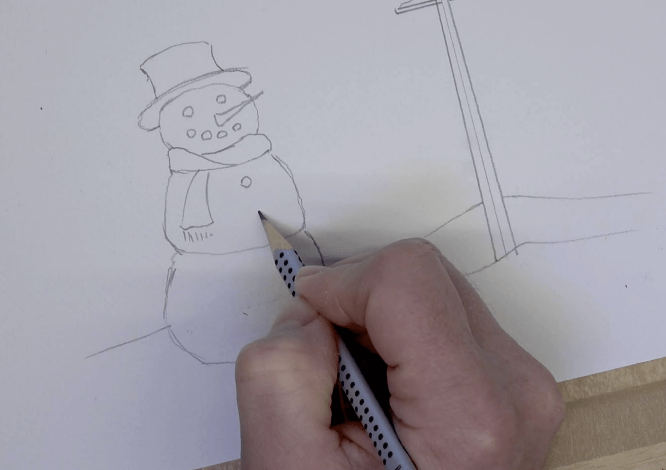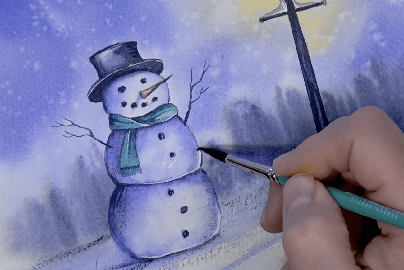 Work with Matthew to paint his lovely scene of a snowman standing under a lamp.