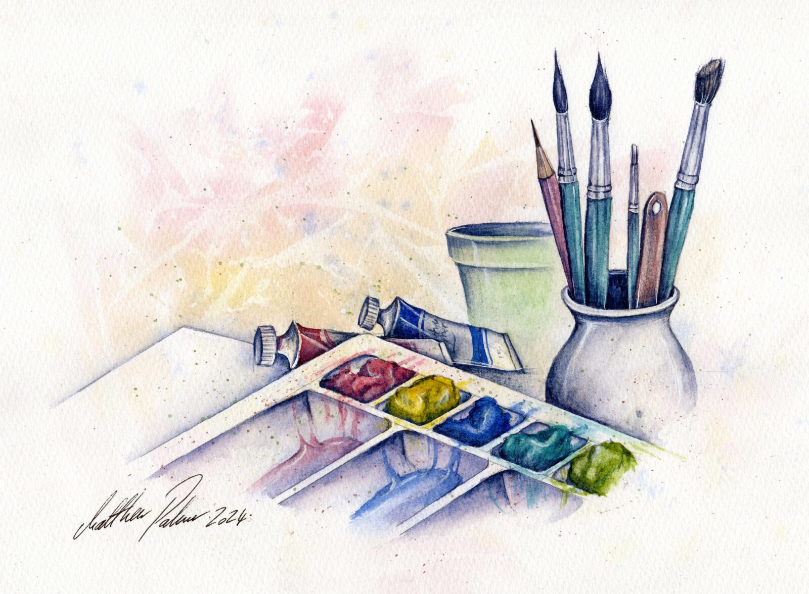Started 1 year ago Paint An Artist’s Studio Still Life, With Palette, Brush Pot, Paint Tubes, Brushes Etc- Previous LIVE Virtual Watercolour Workshop with Matthew Palmer - Special 200th Workshop £10.00 Add to basket Find out more